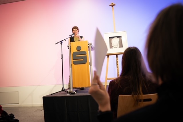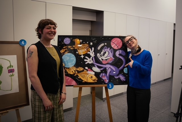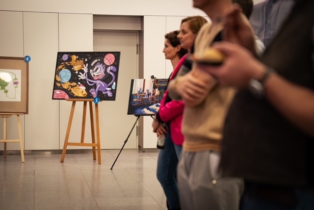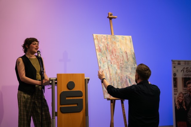 Der Vorstandsvorsitzende der Sparkasse Passau Christoph Helmschrott und die Leiterin der Unternehmenskommunikation Katharina Hasenöhrl stellten dafür den Raum in der Nikolastraße zur Verfügung. Musikalische Unterstützung lieferte die Band „A Bittle Lit“, die Auktion selbst leitete souverän und humorvoll Zoé-Sophie Büttner. Das Vorjahresergebnis wurde so bei weitem übertroffen, fast alle ausgestellten Bilder konnten erfolgreich versteigert werden. Die Hälfte des Gewinns erhielten die Künstler, die andere Hälfte wurde für gemeinnützige Zwecke gespendet.